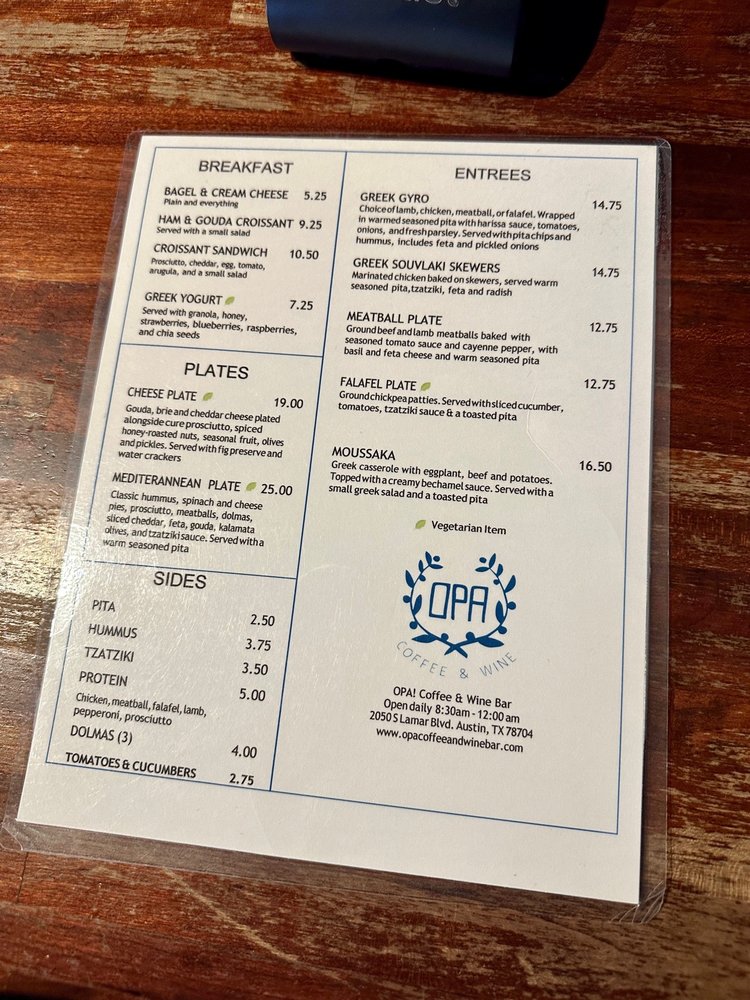 Opa! Greek Cafe, located in Austin, TX, offers a cozy and inviting atmosphere perfect for hanging out with friends or working. The menu is extensive, featuring delicious Greek dishes like baked feta, Greek samples, stuffed grape leaves, grilled veggies, and Mediterranean wraps. The outdoor seating surrounded by beautiful trees creates a relaxing setting, especially during warm evenings. Customers rave about the friendly staff, quick service, and great wine options. However, some have noted minor issues like chipped dishware. Overall, Opa! Greek Cafe is a fantastic spot for enjoying good food, drinks, and music. With amenities like free Wi-Fi, live music, and private dining options, it's a versatile venue suitable for various occasions. Whether you're looking to relax with a cup of coffee or enjoy a night out with friends, Opa! Greek Cafe caters to all preferences.